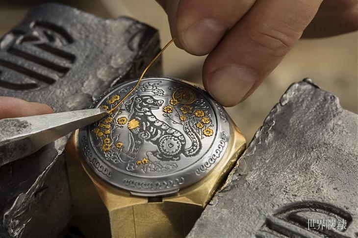 ▲腕表表盖由义大利资深雕刻工匠雕琢,採用的是名为Sparsello的技法,先阴雕出图案线条后,再予以金线嵌花,让生肖主题——狗图案显得更华丽贵气。