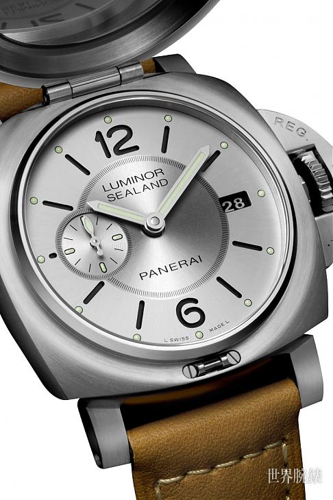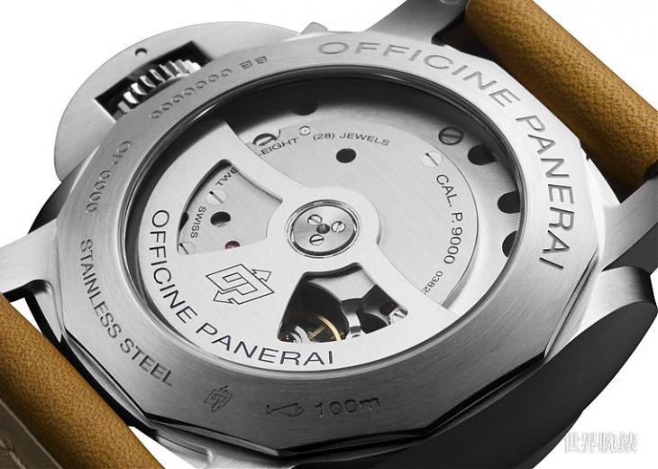 鐫刻的表盖保护底下的灰色面盘,面盘设计简约,其小三针格局包括阿拉伯数字、线型时标及夜光圆点,加上9点钟方位设有小秒盘及3点钟方位设有日期显示窗,方便清晰读时。表盖内侧是一面小镜,装嵌于Luminor 1950表壳(直径44毫米)的磨砂不锈钢表壳,配合得天衣无缝。