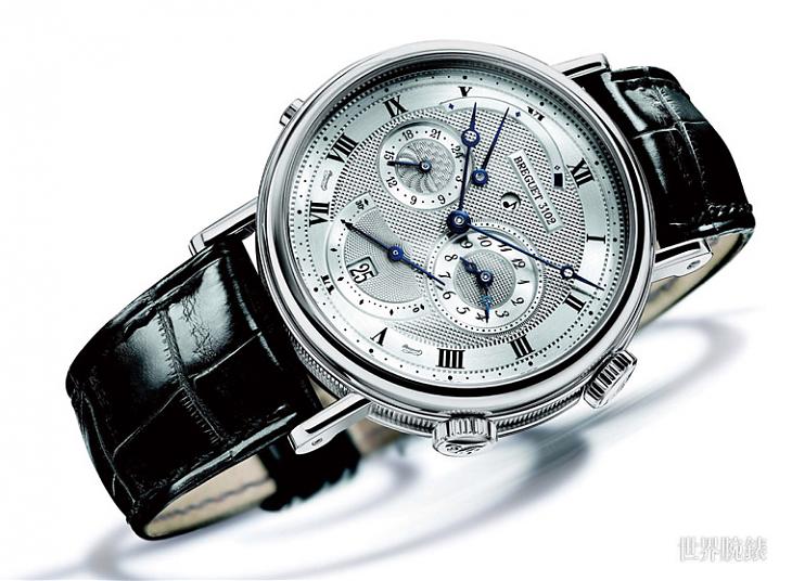 18K白金材质/519F自动上鍊机芯/时、分、小秒、日期显示/闹铃功能/两地时间显示/防水30米/表径39mm