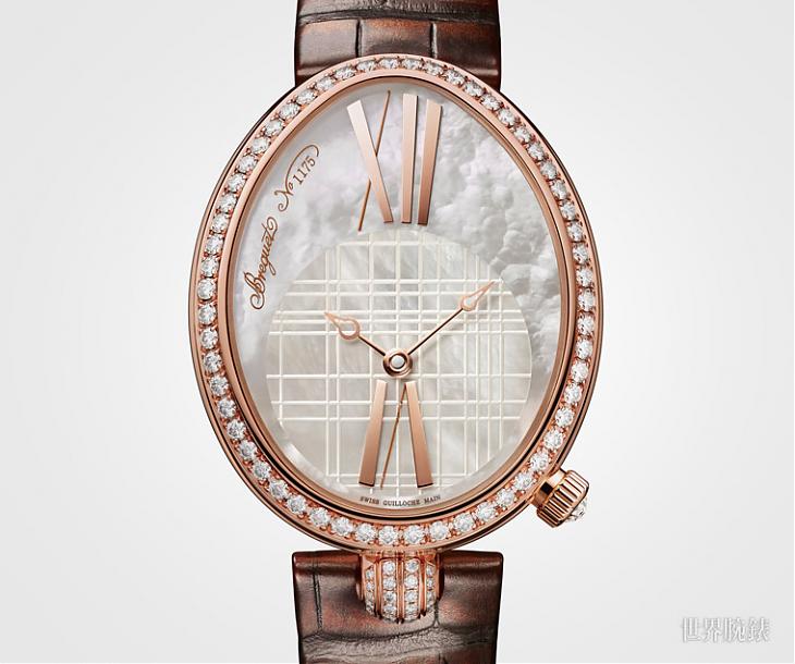 ▲Reine de Naples 8918採用大溪地天然白色珍珠母贝面盘,加上机刻雕花处理,散发独到的优雅美感。