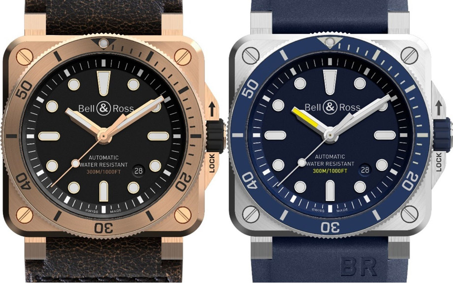 ▲除了Bronze限量版,B&R这个方形潜水表系列,2018年亦追加了蓝色BR03-92 Diver Blue(右)。图片来源:BELL & ROSS
