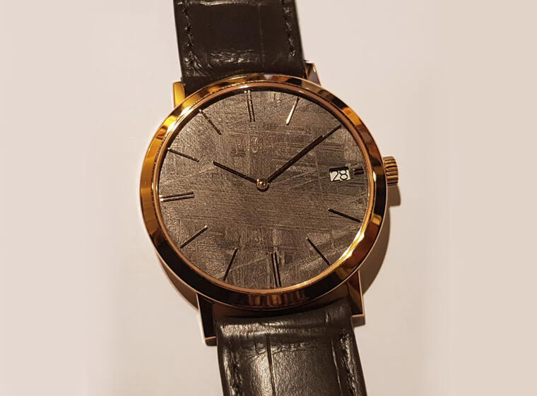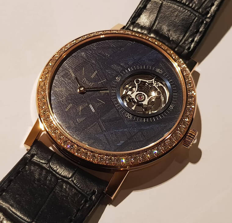 Pre-S.I.H.H.,PIAGET推出经染色处理的陨石面盘,装在Altiplano高级腕表,并搭载自制的超薄机芯,成为表迷收藏的绝佳逸品。将陨石银灰的原色变成咖啡灰与蓝色,与陨石独有的纹理互相烘托,每只均不相同,确实让人心动。基本款限量300只,表径40mm,陀飞轮表限量28只,表径41mm,即将成为明年表界的新宠儿。