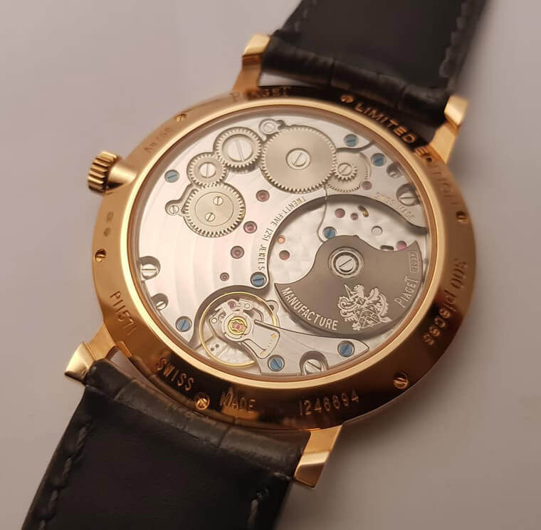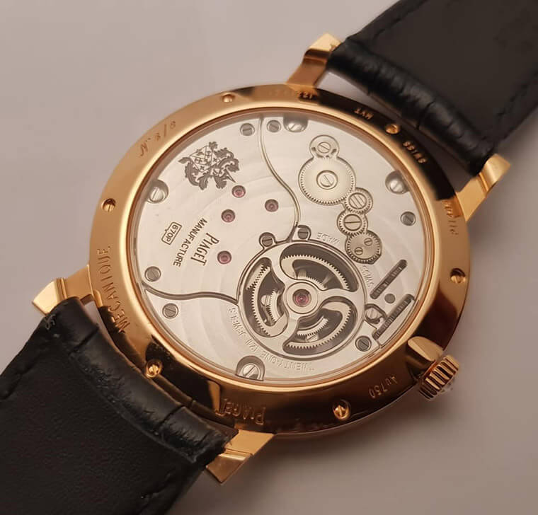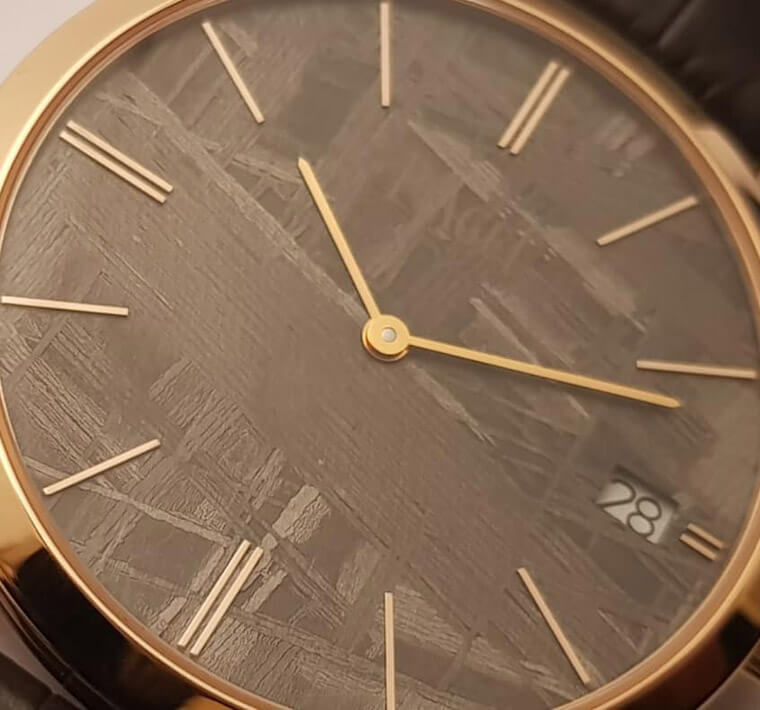 ▲咖啡灰陨石面盘的Altiplano搭载1203P超薄自动上链机芯,厚度3mm。