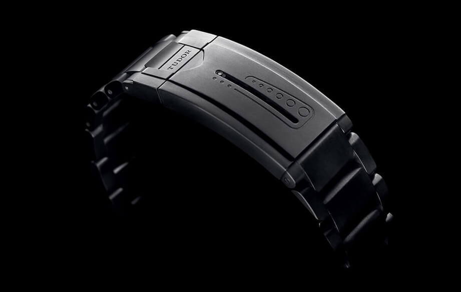 Pelagos钛金属链带的自动调节表扣拥有帝舵取得专利的调节弹簧装置,这个装置能够因应佩戴者进入深海和返回岸上时潜水衣可能会产生收缩和膨胀的情况而主动调节松紧度,我们可以看到表扣上共有9个刻度,代表链带能够调整的长度相当有弹性,这样一来我们就不必一定要靠师傅才能调整链带长度,佩戴的便利性也跟着提升。