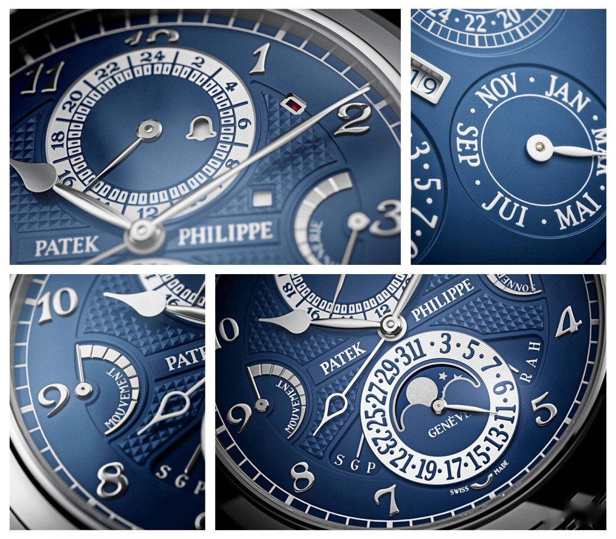 这只双面可翻转腕表,不仅是百达翡丽首款拥有大小自鸣装置的腕表,也是常规系列中最为复杂精密的杰作。腕表拥有多达20项复杂功能,包括五种报时模式,有两项更是在制表业开创先河的专利:可预设鸣报时间的闹铃,以及可按需启动的日期鸣报。表壳饰有手工雕饰巴黎钉纹图案,并以专利翻转机制着称。腕表正面中央饰有手工雕饰巴黎钉纹,显示鸣报功能开关、时间、第二时区、月相、日期、机芯动力储存和报时动力储存。背面则配备万年历以及四个小表盘,包括指针式日期显示、闰年周期、星期、月份和 24小时显示,环绕于中央的四位年份显示周围。