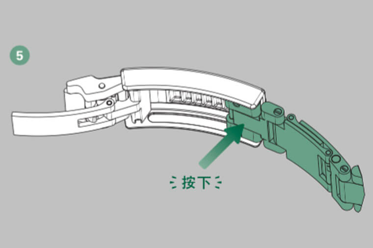 利用Glidelock微调装置可以将表带按照每格约2mm的距离逐格调整,最多可以延长到20mm左右,几乎可以适应各种手腕的大小,通常操作海使的Glidelock微调装置有以下五个步骤。
