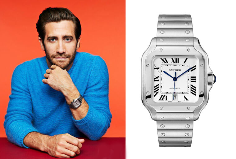 杰克葛伦霍身为CARTIER卡地亚难得聘请的全球形象大使,从2018年起就已经在多个场合看到杰克葛伦霍亲自示范品牌切两年重新改款上市的Santos de Cartier,这款表经过了一番设计上的改变后重新出击,例如它的表冠护肩线条被修改得比较圆滑流线,再来就是表圈部分修改成由12点与6点方向的表圈线条分别向上与向下延伸,彷彿表带直接与表圈接轨般,带有一体成型的视觉感。再来最讨喜的地方还是在于QuickSwitch表带替换系统和SmartLink技术,前者只需按压表带背面与表圈接合处的特设按把,就能轻松卸下表带自行更换,后者则是在接近表扣部分的錬结单侧设有一枚隐藏式按把,一旦按压按把即可松开固定夹,换句换说要调整连带长度也可以DIY,非常方便。杰克葛伦霍比较常佩戴搭配金属链带的Santos手表。