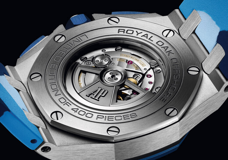 目前线上的44mm ROO计时码表以配置橡胶表带为主(少部分款式则是使用鱷鱼皮表带),但是橡胶带顏色大概也就是黑色与白色这些万年不败的选项,然而这款44mm ROO计时码表不一样,继2018年之后,爱彼再度延续迷彩表带的话题度,蓝色迷彩和蓝色陶瓷圈的搭配一反绿色调丛林迷彩的个性,展现出不一样的阳刚味道,再结合离岸型原本就是强调粗獷豪迈的风格,有了类似这样迷彩橡胶带的案例之后,也让爱彼的手表更能打入年轻族群之中。