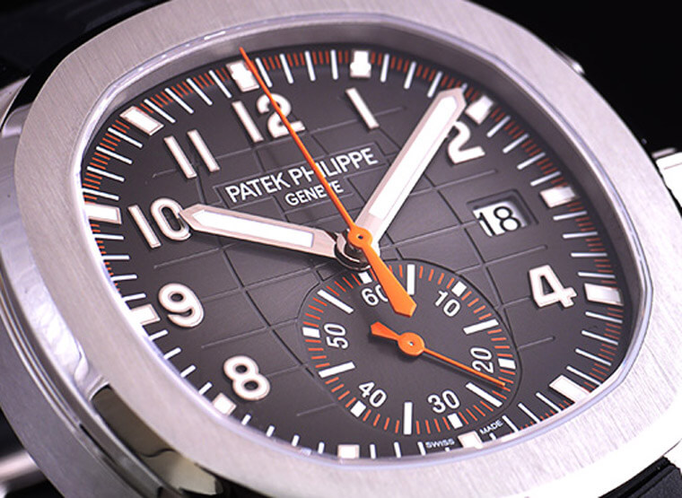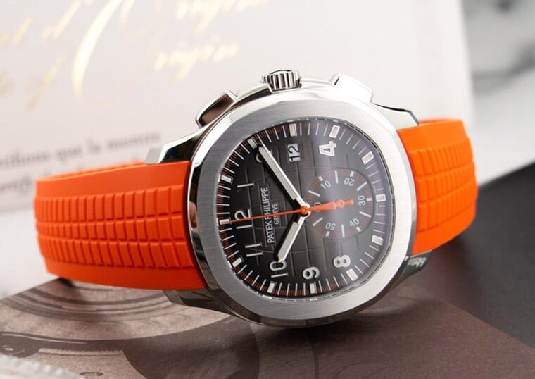 表款面盘必不可少的是系列招牌的放射状凸纹图案,但5968A使用的黑面多了一点渐层效果,赋予表款更讨喜的现代感。因应表款新增的计时功能,所以面盘出现的新变化包括六点方向的60分计分盘、中轴计时秒针,同时也在面盘外围的刻度环部分加入计时刻度,有意思的是,这些新添的细节不约而同使用了橘色,在黑色渐层背景的映衬下格外显眼。这款与多数的计时码表还有一点不同的地方在于它直接捨弃了小时计时盘和小秒盘,虽然类似的双眼或三眼设计现阶段还是计时码表常见的配置,但考量到实用性其实也并非如此绝对,所以百达翡丽大胆摆脱这些包袱,以最清楚的姿态让Aquanaut首发的计时码表迅速建立起本身的辨识度。