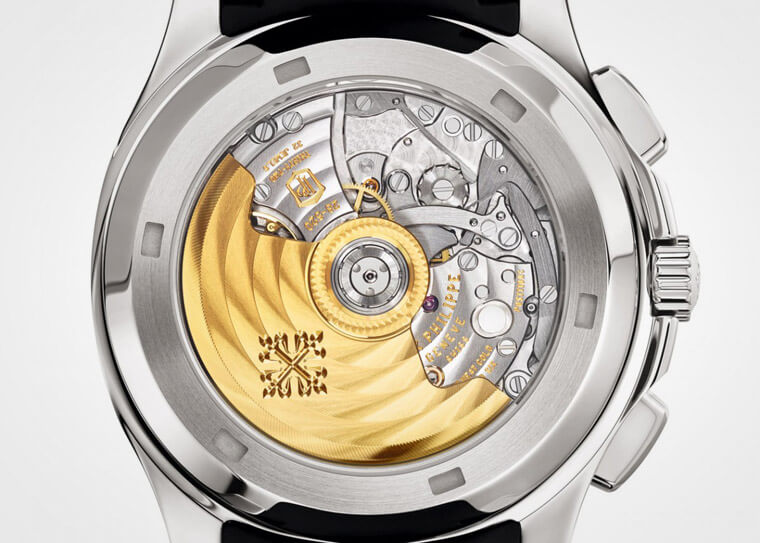 5968A搭载的是CH 28-520 C自动机芯,先前已经套用在例如Nautilus系列的作品上,所以对于喜欢百达翡丽的人而言并不陌生,该枚机芯既有传统的导柱轮装置,同时也结合比较晚近发明的垂直离合机制,理论上较能避免计时功能启动时指针颤动的现象,也因为垂直离合能将零件之间的摩擦情况降至最低,所以即使把中轴计时秒针当作大秒针使用也不会加速机芯零件的磨损情况,可以安心使用(这也是为什麼表款不像一般计时码表会设置小秒盘的原因)。再者CH 28-520 C的计时具有飞返功能,面对需连续计时的状况,它的实用性相对也高,整体而言Aquanaut计时功能初体验各方面条件都有到位,让偏好PP运动表的人有了再次出手的理由。