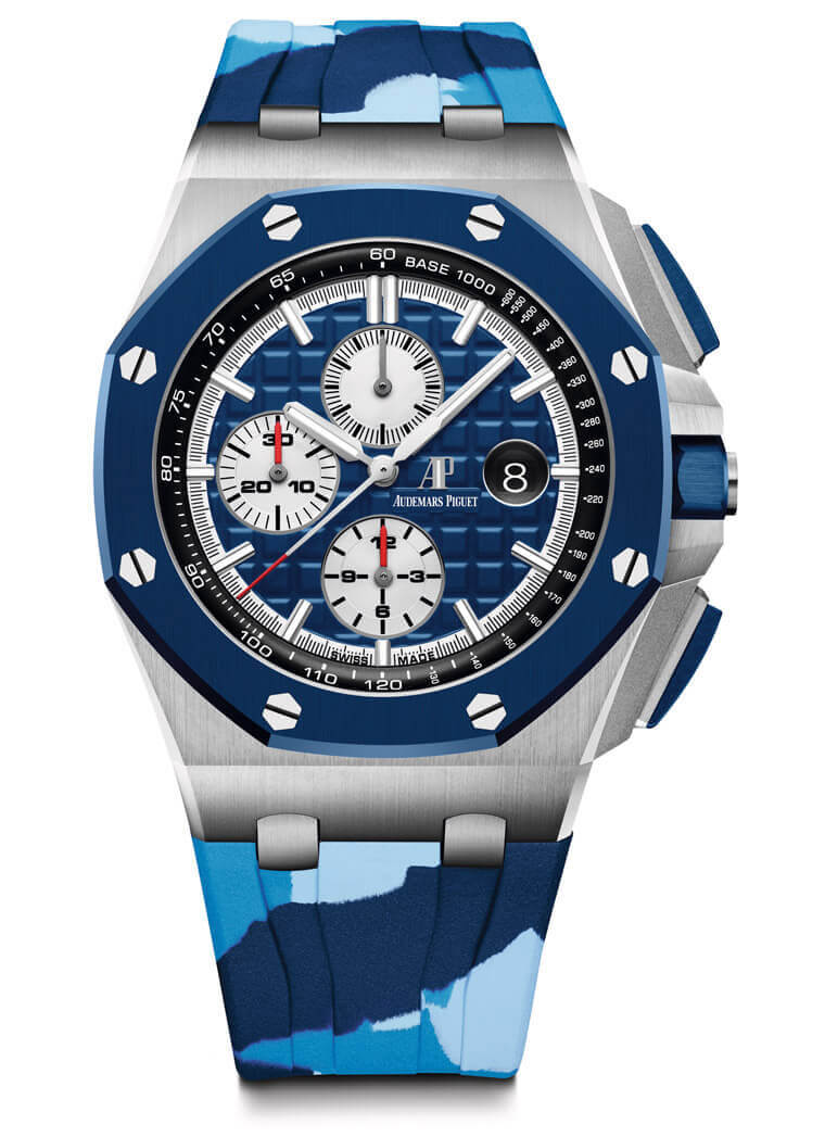 AUDEMARS PIGUET爱彼在2018年推出了多款ROO自动计时码表,裡面主要是42mm的款式,只有一款44mm的版本是例外。相对于42mm款既有贵金属和不锈钢版本、配色也有很多种可选,44mm则是以招牌的不锈钢表壳应战,但它特别的在于换上了绿色陶瓷表圈,就连橡胶表带也开了品牌先例换上迷彩设计,潮味十足一推出之后很多人眼睛都亮了。2019年品牌延续前一年的气势,一口气又发表了具有三款迷彩表带的ROO计时码表,这次除了改款的绿色迷彩,还多了蓝迷彩和巧克力迷彩,这下让想要入手这款的有得伤脑筋了。