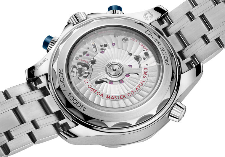 海马潜水300米计时码表搭载的9900机芯先前分别在超霸Racing大师天文台手表和海马Planet Ocean 600米手表等系列中已经使用过,这枚机芯具备导柱轮与同轴擒纵设计,沿袭欧米茄以及传统计时码表的制表元素,此外这款也採用了非铁材质零件,确保机芯能够通过大师天文台认证,意味着它的抗磁能力即使不用软铁内壳保护也能冲高到15,000高斯的水准,如果是正常使用几乎就不用烦恼手表会有受磁的问题,欧米茄这世代大师天文台认证机芯的好处在于它一方面保持了超高的抗磁效果,同时也不用牺牲表背的观赏性,还是能够设置透明底盖让佩戴者好好欣赏机芯的修饰与零件运作动感。