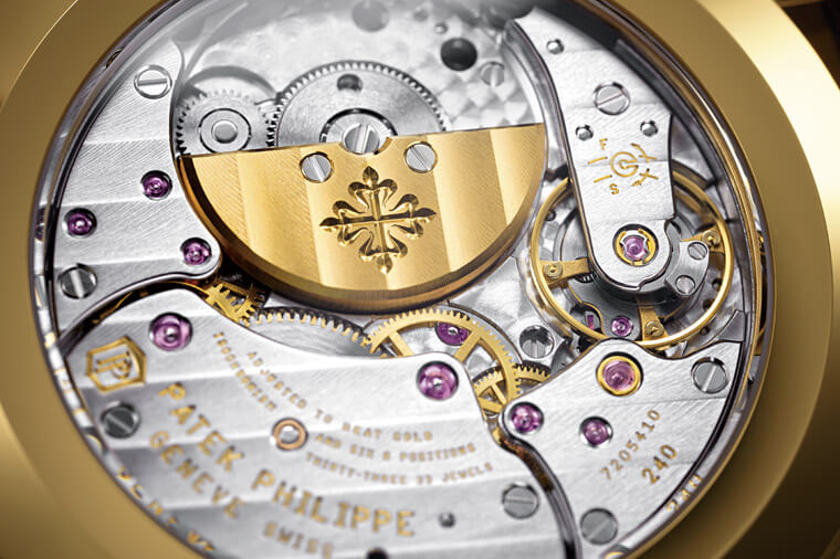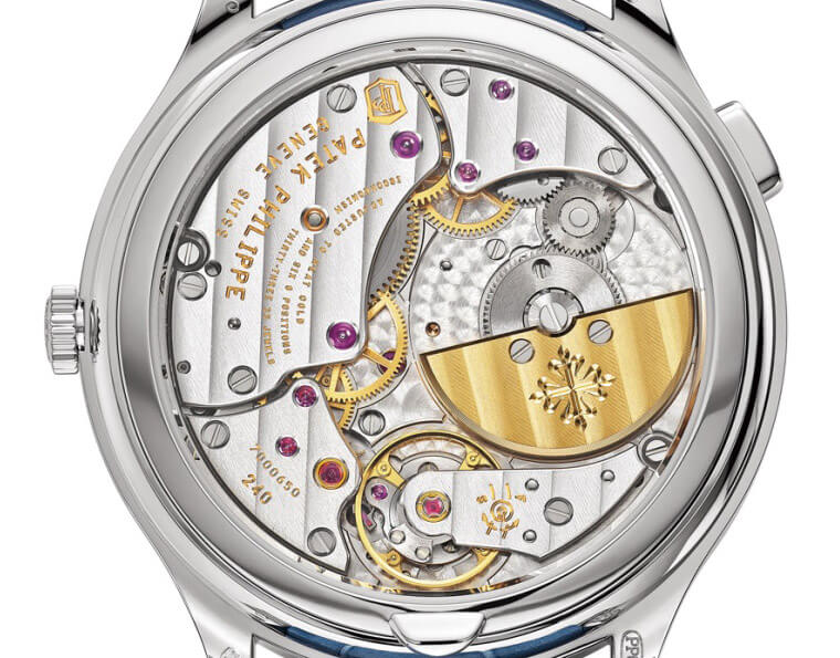 ▲表面上看来5230家族一直都搭载240 HU机芯,但百达翡丽在近20年岁月中仍不时针对机芯结构进行微调升级,如导入Spiromax®硅游丝以提升腕表走时精准度。