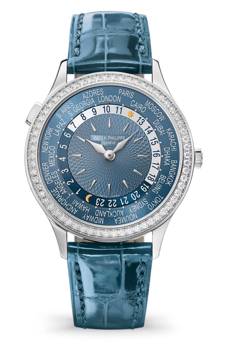 目前百达翡丽的世界时区腕表大致可分为男表的5230与女表的7130,两者搭载同一枚机芯240 HU,且彼此的表径差异不算太大——7130的表径36mm戴在女性手上显得恰好而不会过大,除了表径的大小有别之外,7130额外在表圈镶上多达62颗钻石,就连皮表带的针扣上也镶有27颗钻石,散发出比男表更为华丽耀眼的光芒。7130于面盘布局方面大致承袭5110以来的脉络,如它的菱形指针就有别于现行男表的镂空南十字星造型时针,且7130面盘内圈手工机刻花纹的图案以及三角形金质时标等,也都是与男表同中求异的区辨细节。百达翡丽在2016年以降随着5230的改款而一併调整了24个整时区代表城市的资讯,这部分7130也会跟着时代趋势而作出调整,像是从2019年起,7130面盘上原本代表东八区时区的城市名称就由香港改为北京,力求提供佩戴者正确新颖的资讯。