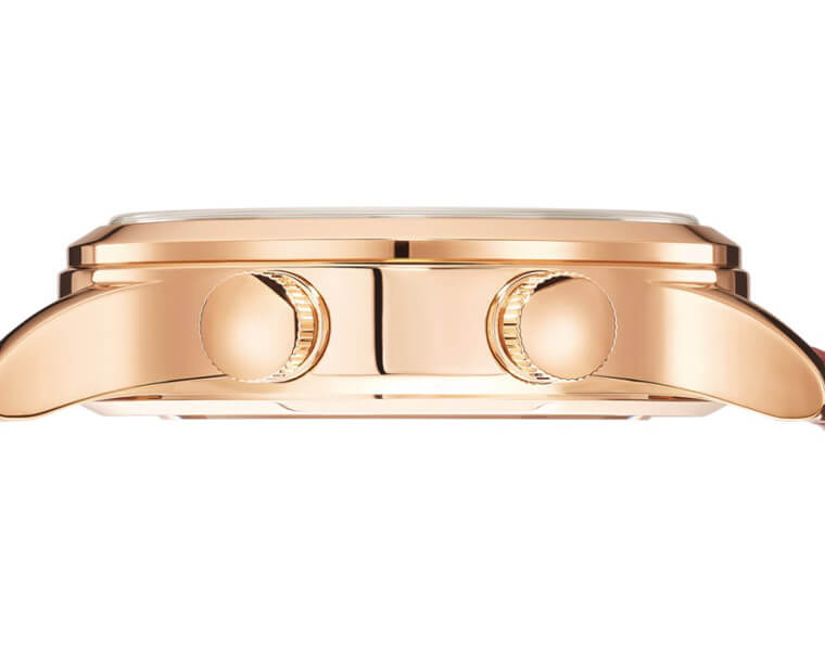 ▲5164表壳左侧的按把乃是为了两地时间而设,佩戴者可以上下按动以前后快调两地时间指针,甚至还能将第二地时间收纳在时针下方,展现灵活应变的功能性。