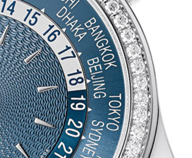 两地时间腕表能够一窥原居地与所在地的不同时刻,世界时区腕表则儼然是升级版的两地时间功能般,能够在一款表的面盘上同步获取全球各整时区甚至是半时区的当前时刻,光靠想像或许会觉得这样的功能很复杂,不过多亏了1930年代一位知名制表师Louis Cottier的创意,他将代表整时区的24个城市显示环、24小时日夜显示环与时、分指针整合在一起制作成世界时区功能模组,有效率且清楚地在腕表方寸之间的面盘上同步显示24个时区的当前时刻,这项专利后来于1959年为百达翡丽取得,到了2000年时品牌别开生面地推出首款世界时区腕表5110。