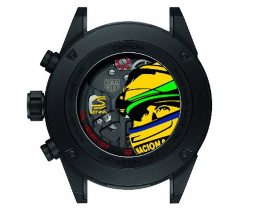 ▲蓝宝石水晶表背鐫刻精美的黄绿色塞纳画像,佩戴着清晰可见的赛车头盔。