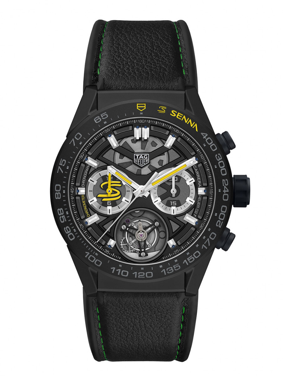 Calibre Heuer 02T陀飞轮计时码表冼拿2019特别版採用雾面黑色陶瓷表壳,搭配与之相称并带有测速刻度的表圈,源自巴西国旗上的黄色与绿色元素,为手表增添了一抹精致与时尚的气息。内衬黑色橡胶的真皮表带饰以绿色缝线,而计时器则以代表冼拿的黄色“S”字样点缀。黑色陶瓷固定表圈设有测速刻度,并印有黄色“SENNA”字样。