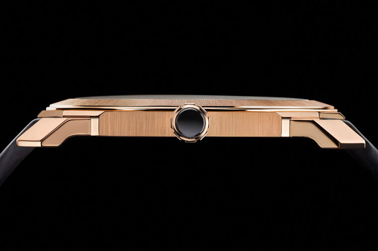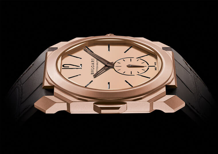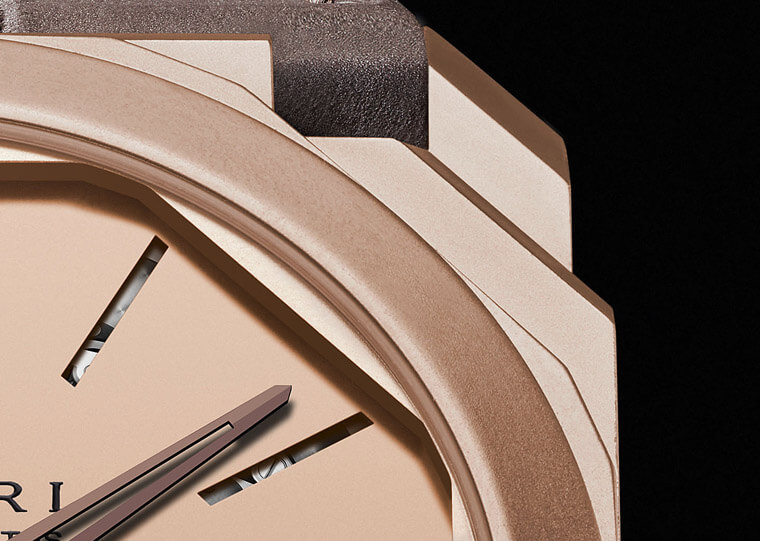 宝格丽Octo系列的表壳因为拥有多达110个切面,向来被视为制作难度很高的一款表,而新款Octo Finissimo除了再次用玫瑰金克服了多切面的难关,宝格丽更于表壳表面加上喷砂处理,一如品牌前几年常在Octo系列表作上所採用的作法,经过喷砂处理后的金属一方面外观质感相对少见,同时也不像拋光工艺容易因为手指的触摸而留下指纹,看起来总是大方而乾净。不过目前最让人好奇的是改为玫瑰金表壳的Octo Finissimo Minute Repeater不知道声音听起来和钛金属表壳会不会有落差?这点有待之后更多资讯曝光后,就能加以对照看看换了材质,对于手表声音表现有没有明显的影响了。