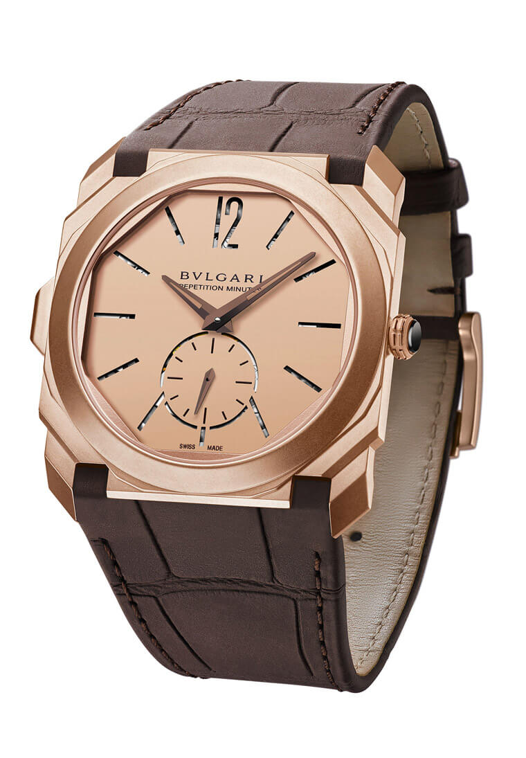 2020年新款的Octo Finissimo Minute Repeater最大不同在于宝格丽将表壳和面盘换上了玫瑰金材质搭配棕色雾面鱷鱼皮表带,整体看起来较2016年前作更奢华气派,但表款的主要设计特徵则都被完整保留。由于制作材质的不同,所以虽然表款搭载的是同一枚机芯(BVL362),机芯厚度不变皆为3.12mm,但是相较于钛金属的Octo Finissimo Minute Repeater表壳厚度为6.85mm,玫瑰金改款的表壳厚度则有稍微厚一些,略增至6.90mm,但是这样的厚度放眼表坛其他三问表还是薄得很惊人,无愧超薄纪录保持人的地位。
