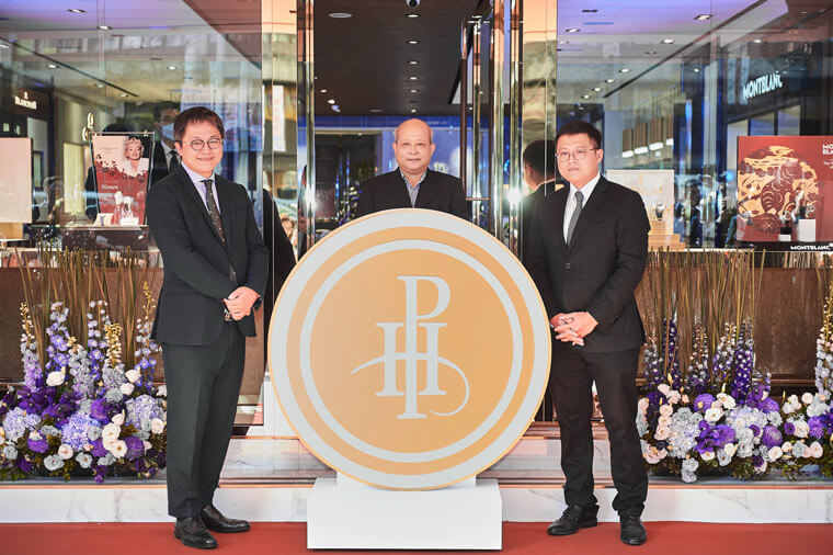 ▲宝鸿堂钟表以英文店名Pro HopeTime的英文缩写PHT做成Logo,由宝鸿堂副总暨业务总监陈俊宾、董事总经理陈秋堂与北区业务经理萧学儒一同揭幕(左起)。