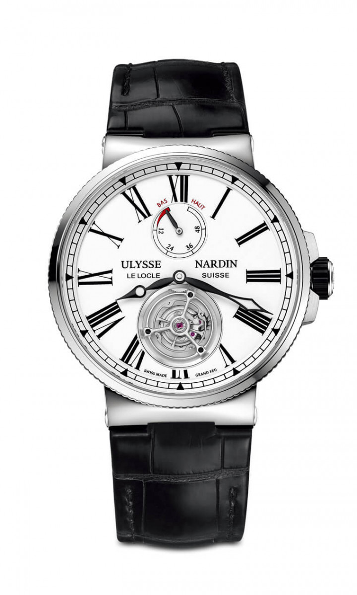 不锈钢材质/UN-128自动上链机芯/时、分显示/陀飞轮装置/动力储存显示/大明火珐琅面盘/蓝宝石水晶镜面、透明底盖/防水100米/表径43mm/参考价:NT$ 939,800