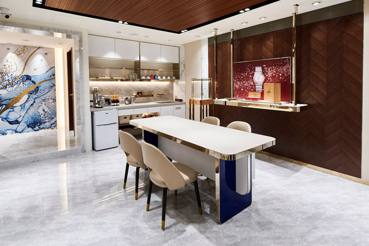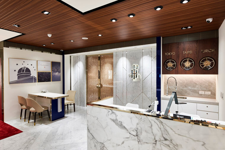 店内大量採用大理石墙面设计,搭配精致优雅的金色线条,延伸空间感并带来温暖细腻元素。其中贵宾室开放式的陈列架展现了宝鸿堂希望提供贵宾近身Touch&Try的体验式服务。此外,交易桌也融入了手机无线充电设备,贴心便利客户使用。至于来到店内的消费者也能享受到高级爱马仕咖啡杯盘组、品嚐Nespresso顶级义式浓缩咖啡、限量风味黑咖啡、法国玛黑茶及台湾顶里山好茶,让人体会宾至如归的自在感,包含销售顾问们亲切的问候与招呼,同样让人备感舒服。宝鸿堂钟表台北忠孝店处处可见用心之处,热情欢迎每位消费者到来。