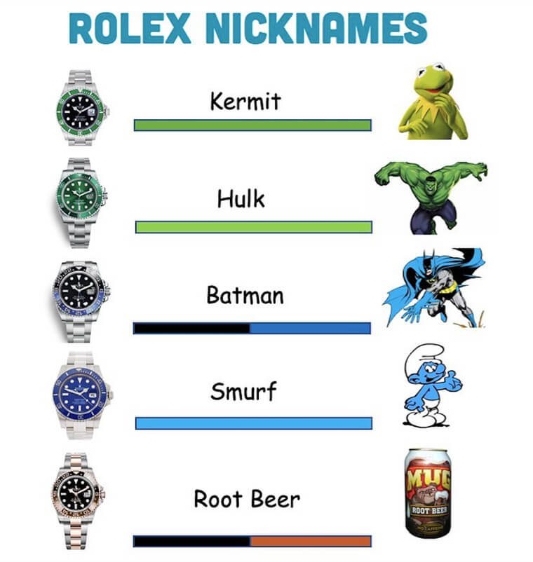 同样的道理,国外的表友也有一些关于知名手表的共通绰号,先前在Instagram就有国外表友分享了一张有关劳力士热门表系列(Submariner和GMT-Master II)的绰号对照图,有些我们可能之前都已经听说过,但从图片上图文并茂的表达方式,一看就更能明白为什麼这几款表会获得那些耳熟能详的绰号。