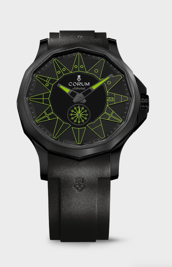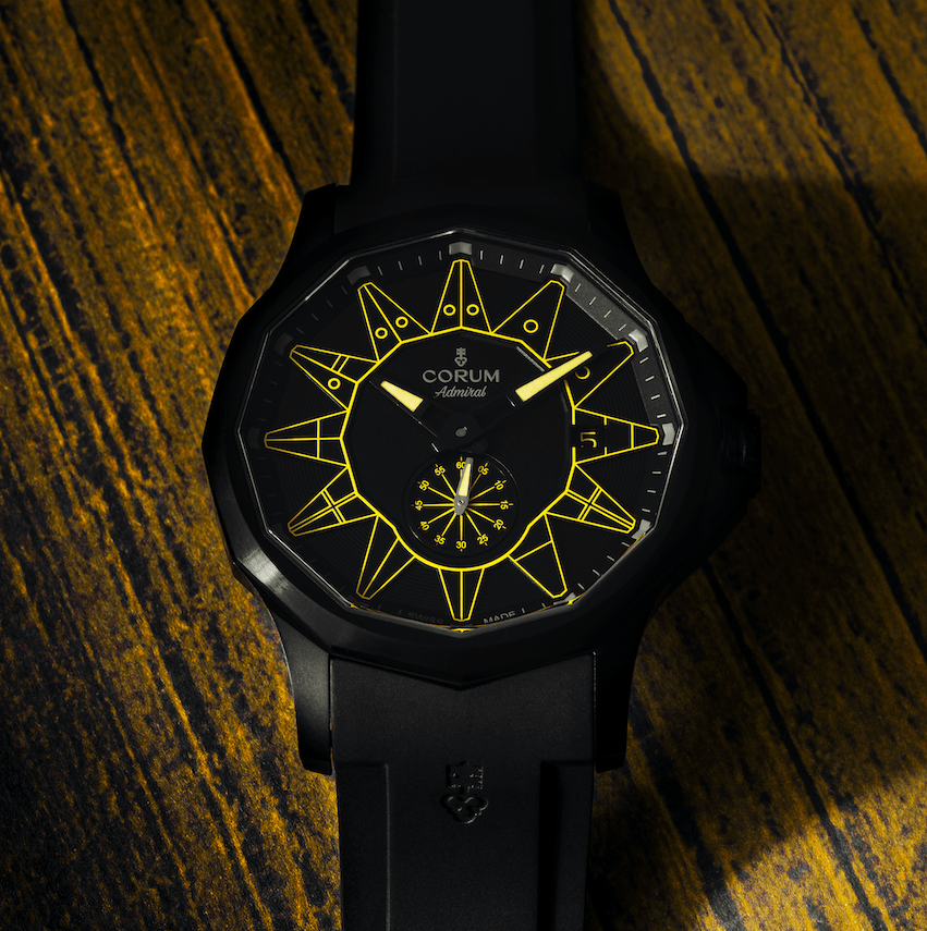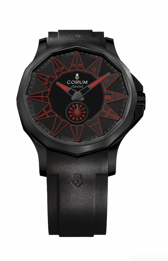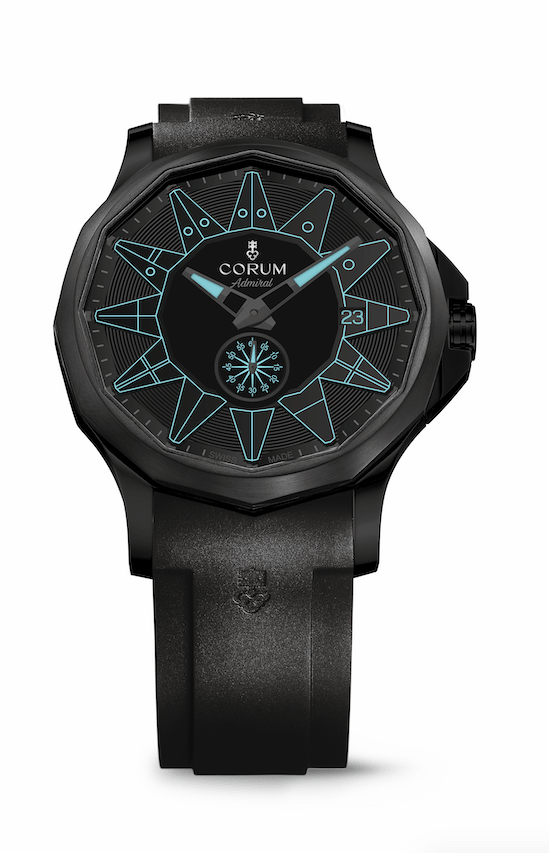 對比之前色彩繽紛的海軍上將腕錶,最新推出的Admiral 42 Automatic Full Black是系列中首發的全黑款式。以不鏽鋼打造的經典12邊形錶殼,經過黑色PVD加工處理,並配以黑色黃銅面盤;代表12小時刻度的航海旗幟,以及顯示分鐘的刻度,則以不同色度的黑灰色呈現,使簡樸純粹的全黑設計顯得更加立體。