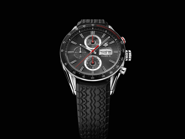 作為Carrera 家族的新成員,這款限量版產品正是TAG HEUER對現代賽車史上最著名、最危險,卻也是最令人血脈噴張的賽車盛事——摩納哥大獎賽的獻禮,並已被邁凱輪車隊列為標準配備手錶。錶圈和測速儀上刻有紅色Monaco Grand Prix字樣,藍寶石水晶底蓋上彩印著摩納哥大獎賽的標誌和手錶的限量編號(X/4,000)。黑色橡膠錶帶以1963年F1大賽的輪胎為靈感,採用輪胎圖案浮雕設計。開闊的碳灰色面盤上以人手鑲嵌刻度,刻度覆以夜光塗層,碼錶分鐘、時鐘和走時秒針的三個計時窗口分別位於12點、6點和9點位置。指針和按鍵處的火紅色設計成為整款作品的畫龍點睛之處,將這款經典手錶的精湛工藝與瑞士尖端技術展現地淋漓盡致。