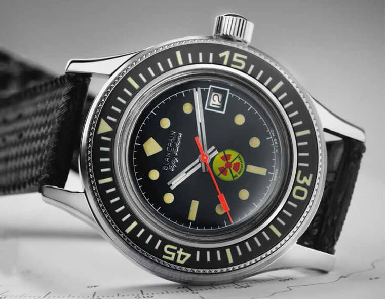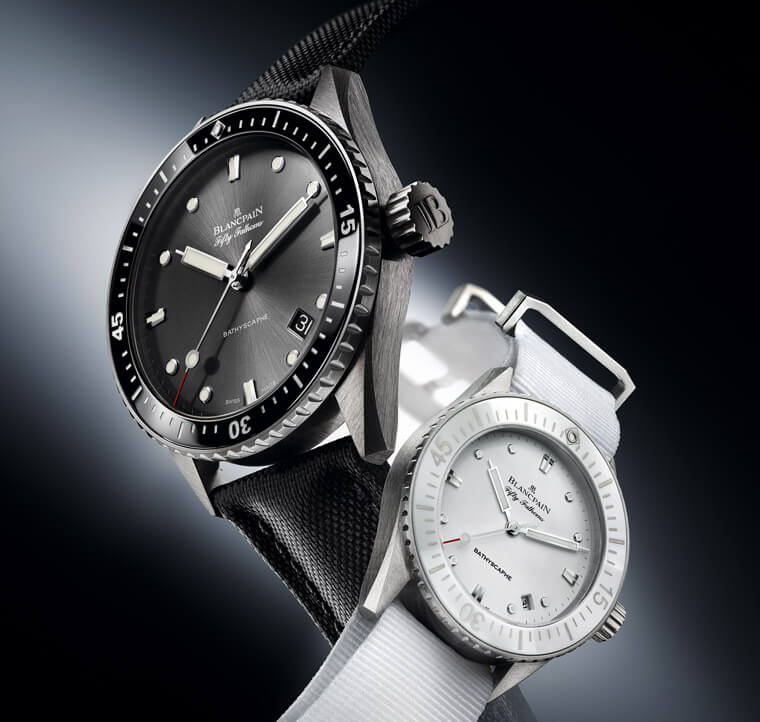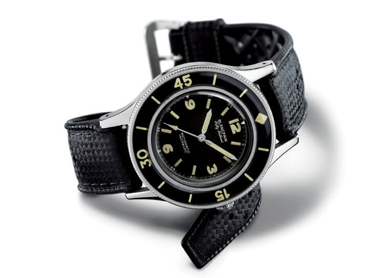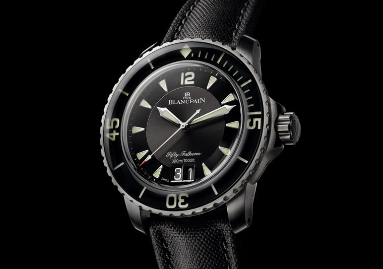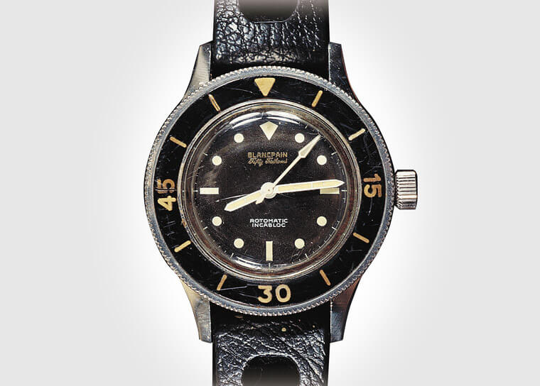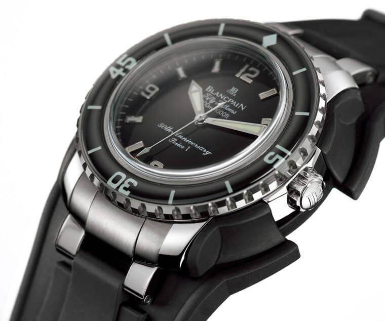 Fiechter先生於開始投入研發潛水錶後,他開始在Maloubier與Riffaud提出的概念草圖中融入自己的創意;有意思的是,如今我們在多數潛水錶身上看到十分標準的配備,譬如單向旋轉錶圈、夜光時標設計、O型防水墊圈、錶冠防水系統以及容易閱讀的黑色面盤乃至抗磁功能等,都是源自於Fiechter先生此時所提出的構想。寶珀將結合上述這些設計特徵的潛水錶命名為「五十噚」,其實背後的意義不難理解,「噚」是當時英國測量水深的公制單位,所以五十噚代表的意義就是腕錶的防水能力,五十噚換算成公尺約91.45——這已經是當時公認潛水者佩戴氧氣筒可潛入的最大深度,腕錶優異的防水性能從名稱中便能一覽無遺。