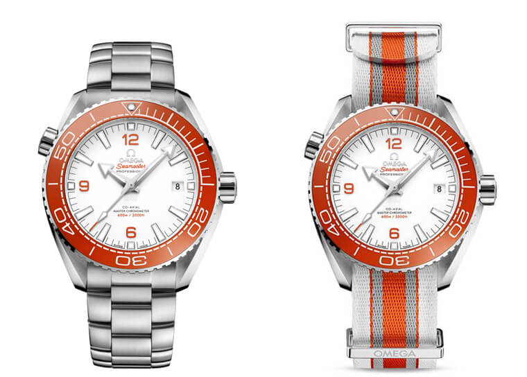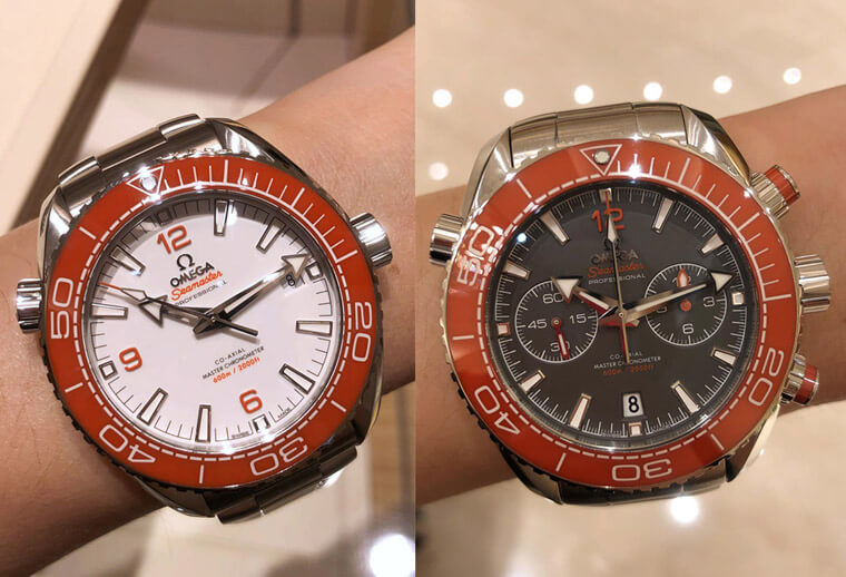 橘色Planet Ocean 600M最早在2005年推出,當時那款搭配黑色面盤,不過隨著近年歐米茄開始慢慢換上陶瓷錶圈之後,橘海馬彷彿也消失在我們的記憶中,市售款中大概只剩下部分Planet Ocean 600M會採用橘色的橡膠潛水計時圈低調地傳承這個算是歐米茄代表色的顏色。前兩年歐米茄再次推出橘色錶圈的海馬Planet Ocean 600M,這次不同的是錶圈換上了陶瓷材質、面盤從酷酷的黑色換成斯文的白色陶瓷面盤,連機芯部分也更新成大師天文台認證機芯(8900機芯),特徵就是即使不用軟鐵內殼保護機芯,光是透過機芯內部的非鐵材質零件,就能有把握抗磁抗到15,000高斯以上的程度,也因此新款更能理直氣壯地露出機芯讓佩戴者好好把玩一番。