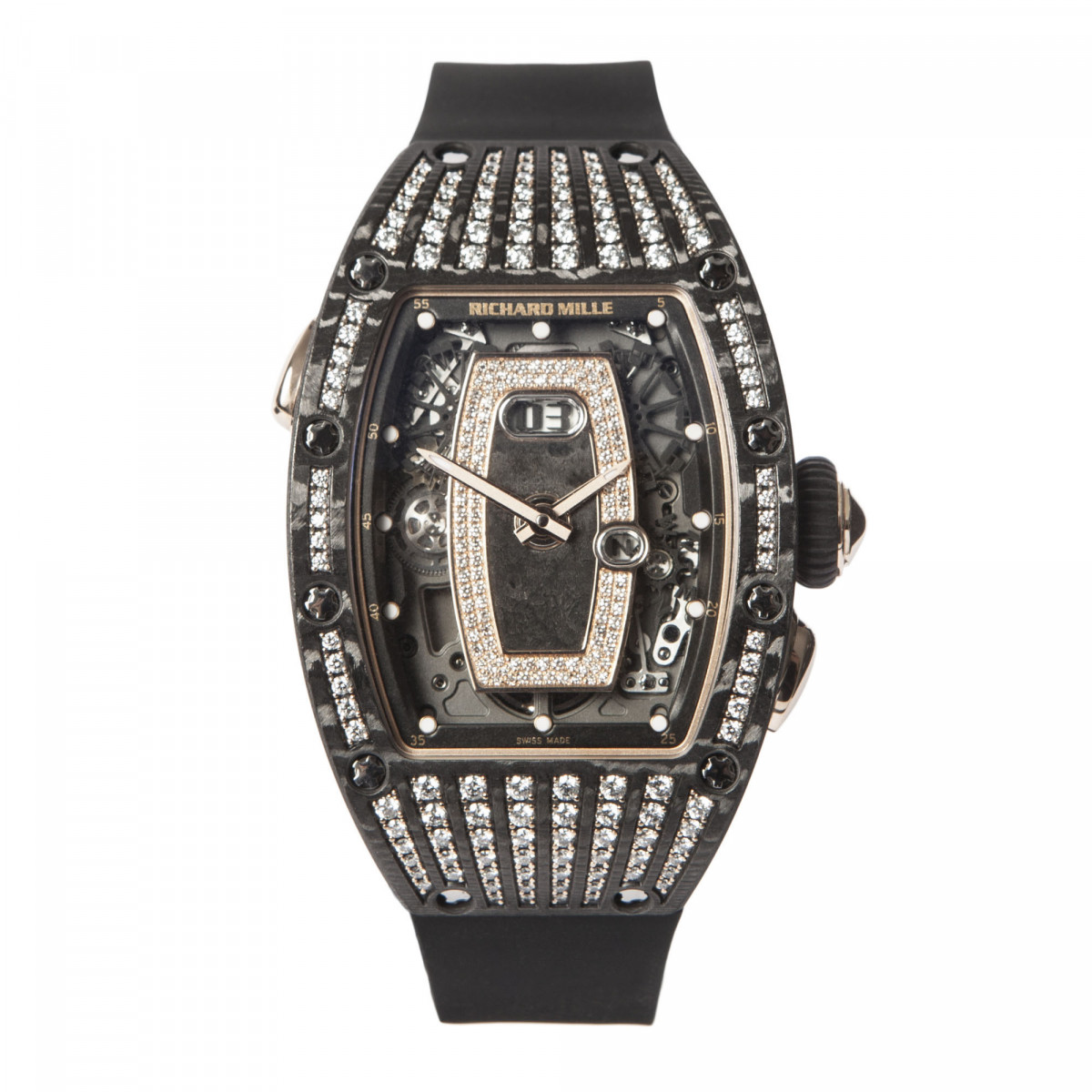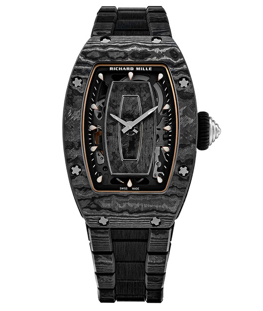 其中例如RM 037 Carbon TPT®碳纖維鑲鑽女錶運用Carbon TPT®碳纖維,為機芯提供最佳保護,還賦予手錶獨特的美感。Carbon TPT®碳纖維材質鑲鑽是RICHARD MILLE的一大突破。金屬材質可讓工匠們用傳統的工具來 製作固定鑽石的金屬爪,而Carbon TPT®碳纖維卻不同,它的硬度和防刮性必須使用配備鑽石磨具的專 用CNC數控機器,方可完成鑲嵌相關工序。全手工拋光的白金材質金屬爪是另外製作的,依序嵌於錶殼上排布細密的直徑0.25mm小孔,從 而將250顆至臻美鑽牢牢固定在RM 037身上,完美詮釋品牌高超工藝。