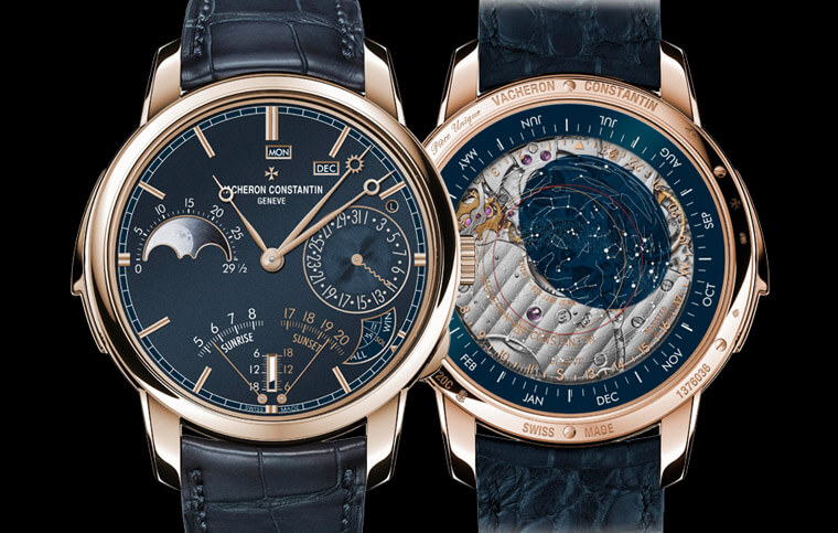 18K金材質/1731 M820手動上鍊機芯/時、分、日期、星期、月份、閏年顯示/三問功能/萬年曆功能/時間等式功能/回歸線及黃道十二宮盤顯示/月相顯示/日夜顯示/日出日落時間顯示/錶背恒星時顯示/星空圖/藍寶石水晶鏡面、透明底蓋/錶徑45mm