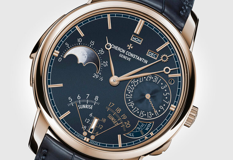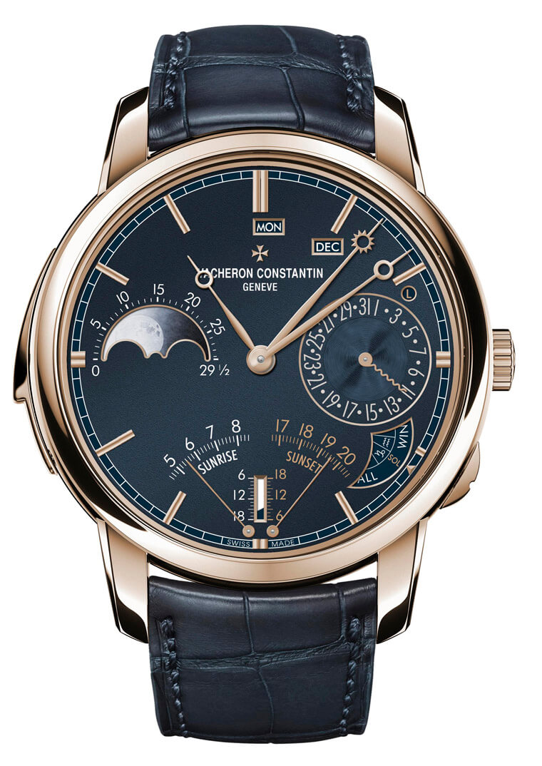 錶款的深藍色面盤上,從容而有條理地展示出萬年曆資訊,包括三點方向的指針式日期,十二點到兩點方向分別羅列了星期、月份和閏年視窗,而在九點方向還有扇形的月相顯示,此處還結合日夜顯示作用,讓人更能一目了然白天與黑夜的分別。面盤下半部分設有指針標示日出和日落時間,並以線性刻度顯示晝長和夜長,此外透過4點鐘位置的視窗,佩戴者還能看見指示著黃道十二宮、季節、冬夏二至點和春秋二分點的視窗。