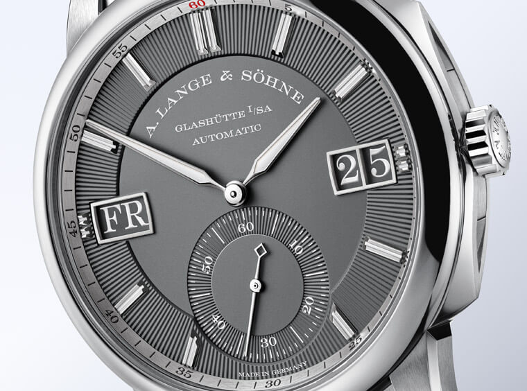 錶款面盤這次從不鏽鋼版本的藍色改回朗格旗下手錶屢見不鮮的灰色,至於面盤的格局倒是一模一樣,包括三點方向的大日期顯示、九點方向的星期顯示以及六點方向的小秒盤等,同時十二點方向的分鐘刻度”60”也特地七上紅色以與其他黑色刻度區隔(隱隱增加一些活力動感)。而有別於不鏽鋼款的面盤外圍是以Azurage同心圓紋加上面盤內圈的粒紋示人,這次白金灰面款面盤外圈改成放射狀刻紋、內圈則是相對平滑的霧面紋路,並非只是換個顏色如此簡單。