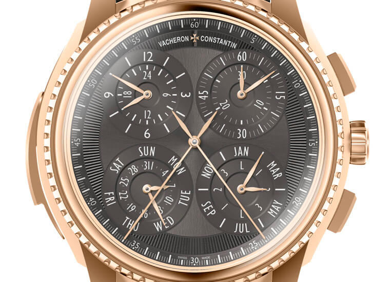 錶款的正面佈局非常充實,除了中軸兩根指針以外,面盤還分佈了四枚上下左右對稱的小錶盤,除了設有追針計時功能外,更配備了計時和曆法顯示,上方兩個對稱小錶盤指示著時間:左側小錶盤的外圈為小時顯示,內圈有一個24小時刻度盤,用於顯示第二地時間;右側小錶盤的外圈指示分鐘,內圈則為一個30分鐘計時盤。萬年曆功能則由下方的兩個小錶盤指示:左側顯示日期和星期,右側則指示月份和閏年。中軸兩根指針並非時針和秒針,而是追針計時指針,所謂的追針是指當其中一根指針在走動時,可顯示兩根針之間的間隔時間,而當停針重啟時,又會快速「追上」仍在運作中的另一根指針。