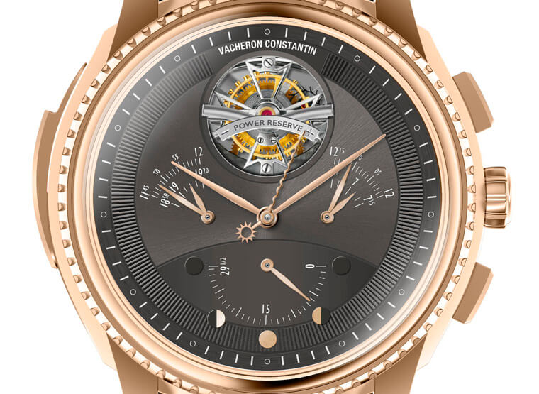 相較於手錶的正面,背面看起來就相對簡潔多了,但這不表示背面的複雜度比較低。中軸一根飾有太陽圖形的中央指針用以指示真太陽時。此外,三點鐘和九點鐘位置顯示的日出日落時間與晝夜時長,也讓時間資訊更為豐富,同時展現出高階的製錶工藝。背面面盤下方的半圓形小錶盤上,一根逆跳指針指示著月齡和月相,這款錶的複雜度如此之高,表示月相的精密度也不同於一般,錶款的月相每1000年才需要調校一次。至於面盤十二點方向還能看到陀飛輪裝置,這枚陀飛輪不僅有江詩丹頓代表性的馬耳他十字框架,框架上還加了動力儲存顯示刻度,搭配中軸的波浪形指針,顯示手錶65小時的動力消長情況——這是指在一般走時情況下的動力,如果佩戴者啟動了計時功能,那麼手錶的動力最長可以延續40小時之久。