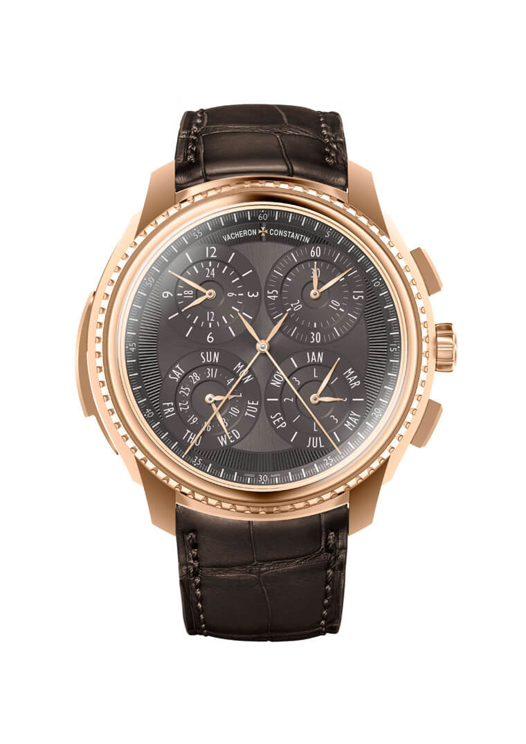18K玫瑰金材質/2756手動上鍊機芯/偏心時、偏心分、日期、星期、月份、閏年顯示/三問功能/萬年曆功能/陀飛輪裝置/追針計時碼錶功能/時間等式功能/兩地時間顯示/逆跳月相和月齡顯示/日出日落時間顯示/晝夜時長顯示/動力儲存顯示/藍寶石水晶鏡面/錶徑50mm
