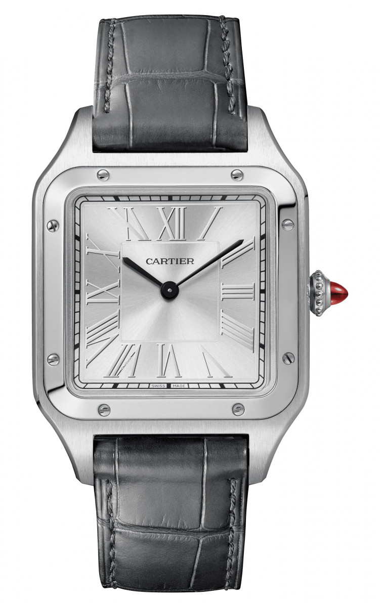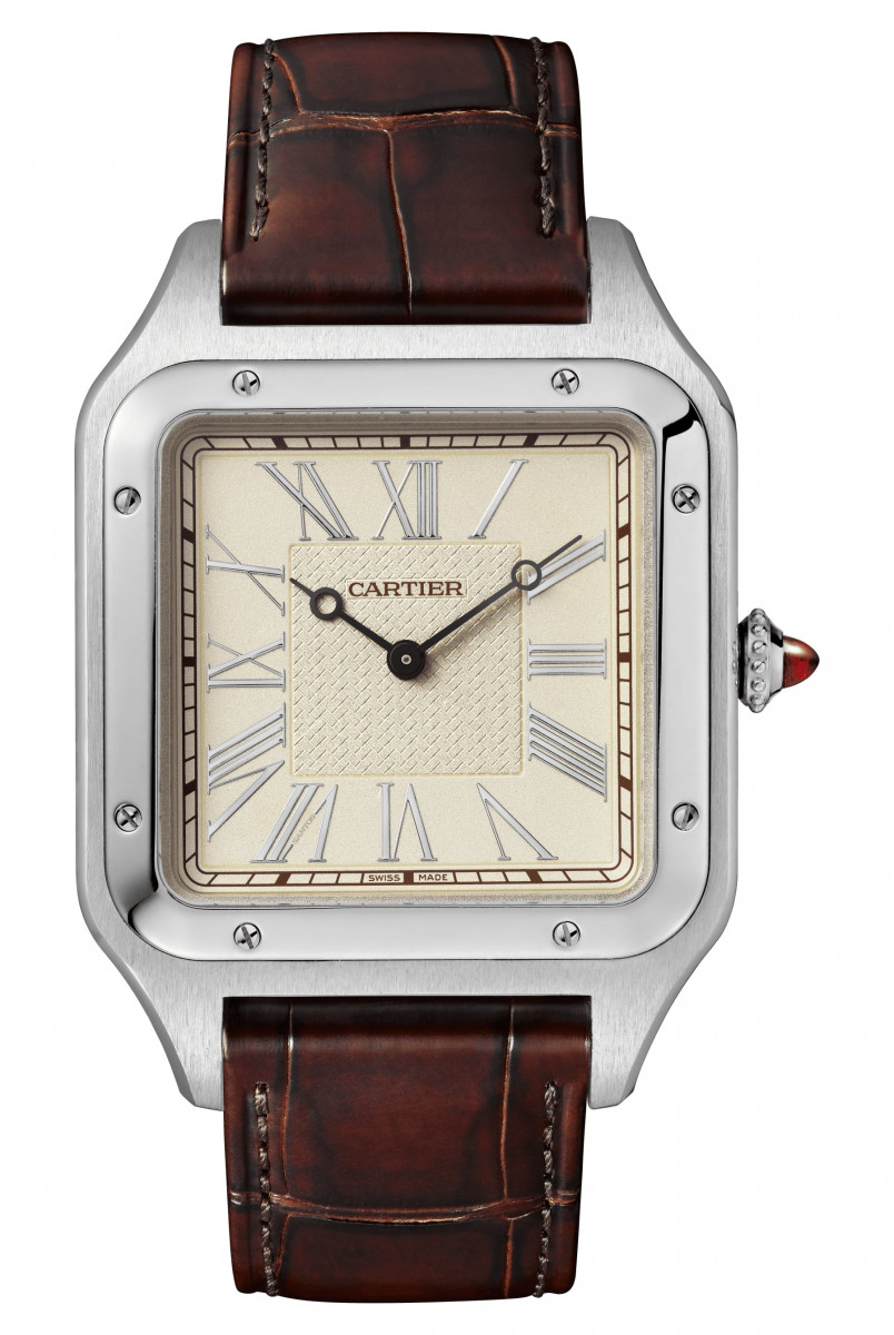 Santos-Dumont「Le Brésil採用鉑金錶殼、銀色面盤上點綴12個拋光金屬羅馬數字,搭配劍形指針和紅寶石上鍊錶冠,精細的表面拋光或磨砂處理與斜面錶緣散發珍貴氣息。錶背鐫刻山度士-杜蒙的第一架飛行器「Le Brésil」的設計圖,根據這位飛行員,這架1898年創造的飛行器是「最小」而且「最美」的。「Le Brésil」於1898年7月4日首次飛上青空;繼此之後,1898年至1909年之間誕生了一系列編號1至22的熱氣球,體現亟欲跨越重力法則的多番嘗試。