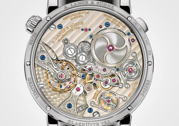 為了呈現卓越音質,朗格研發人員仔細調節所有相關組件,如錶殼、音錘、音簧及機芯結構, 以確保所有組件能互相諧協。偌大的 18K 白金錶殼傳遞清晰響亮而悅耳的聲音,經過手工悉心調節的音簧則可發出純淨清脆、完美和諧的聲響。