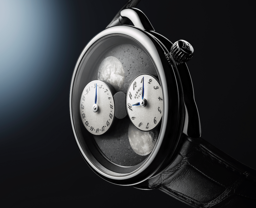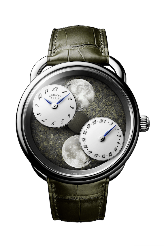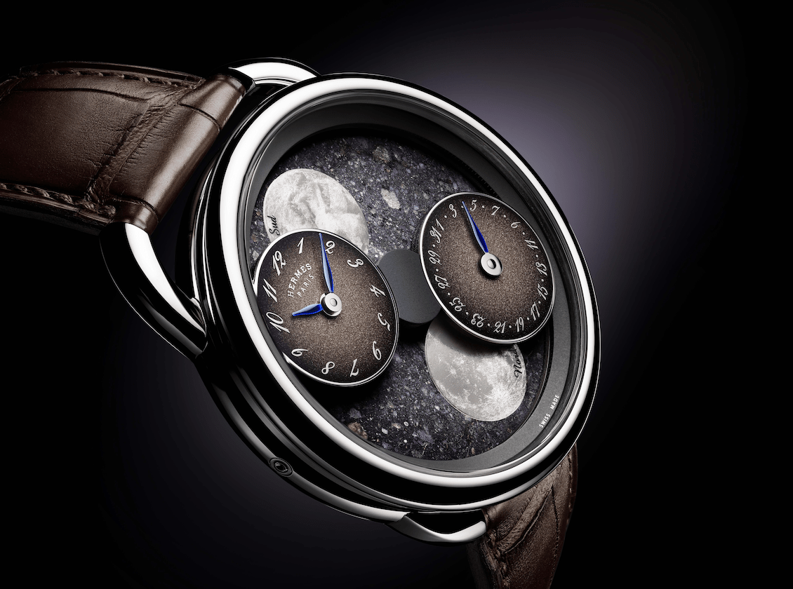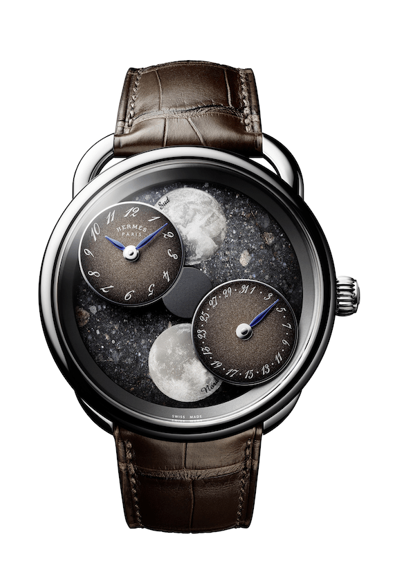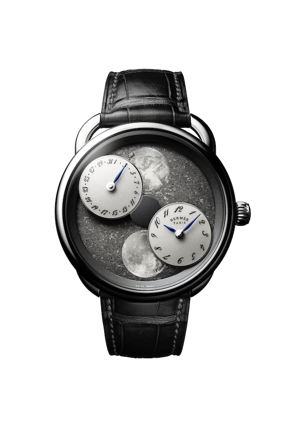 雙月相不採用傳統的視窗顯示設計, 而是大氣地蟠踞在整個盤面上,彰顯出愛馬仕對製作機械錶自由不羈的詮釋觀點。由Henri d’Origny設計、擁有不對稱錶耳的Arceau手錶,錶殼成了以隕石為月亮打造的舞台空間,而如衛星般藉引力繞行的兩個漆面副錶盤,則以極具特色的斜體阿拉伯數字顯示時間與日期。