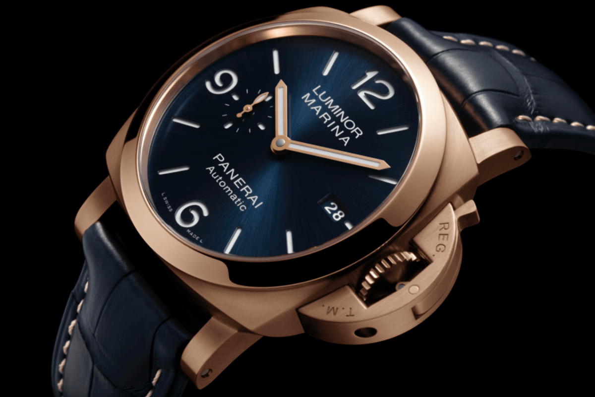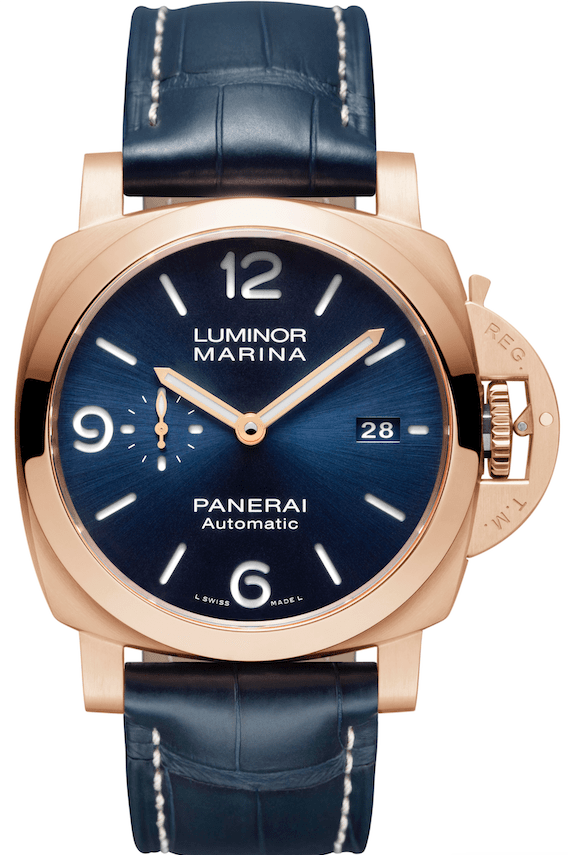 新錶採用沛納海Goldtech™ 紅金製成,貴金屬的材質特性令作品精緻優雅。紅金由沛納海創意工坊特別研發,內含鉑金 (0.4%) 與較高比例的銅 (24%)。這兩種材質的運用使得手錶擁有濃厚、獨特的顏色,並擁有極高的機械耐受性和抗氧化性。錶殼緞面與拋光的交替潤飾,增強了手錶的美觀性;深藍色三明治面盤以太陽放射紋修飾,強化了手錶的動感特質。