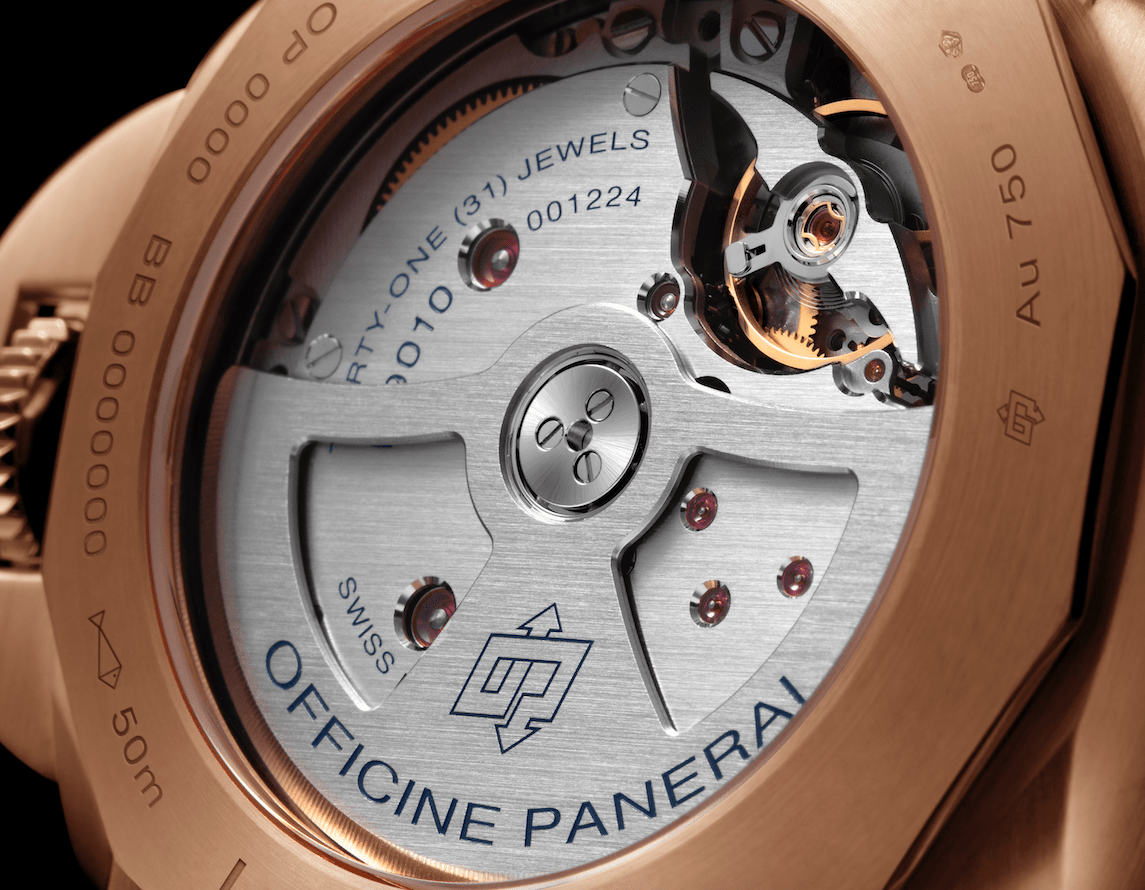 手錶搭載了P.9010自動機芯,完全由沛納海諾沙泰爾製錶廠自主設計、研發。機芯性能卓越且高度耐用,兩個發條盒提供三日動力儲存。此外這枚機芯亦配備小時快調裝置,可雙向調校,亦可同步調整日期。