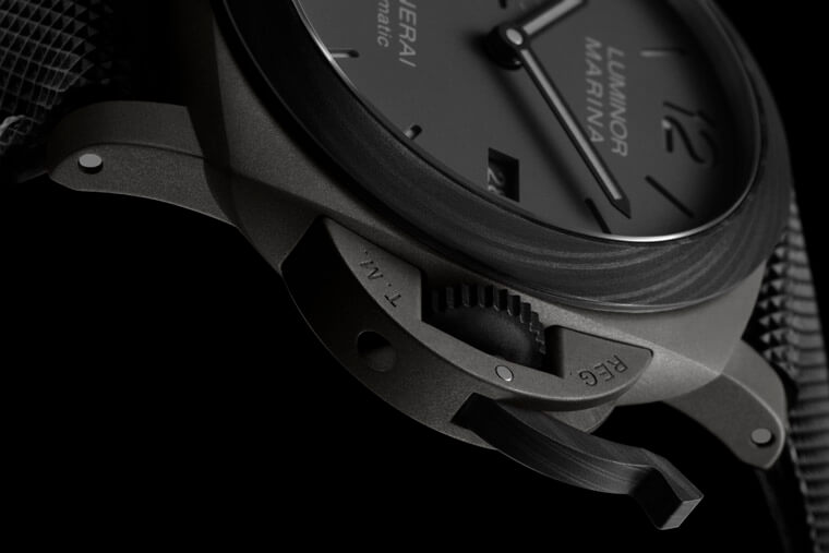 Luminor Marina DMLS的外部零件方面包括錶殼、錶耳以及錶冠護橋均由直接金屬雷射燒結鈦金屬製成,至於錶圈、錶冠和釋放錶冠的槓桿零件則是由Carbotech塑造,另外錶背的實底蓋則又是採用傳統的鈦金屬(另鍍上黑色DLC鍍層呼應整體的黑灰色調)。
