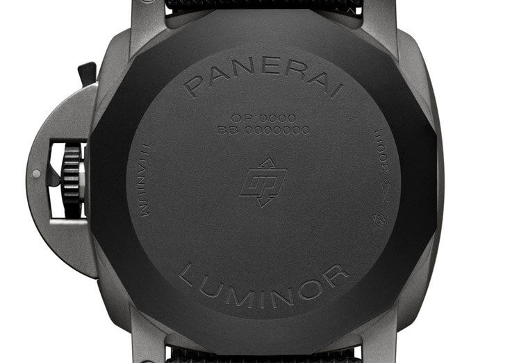▲底蓋採用的是傳統的鈦金屬材質,這邊可能考慮到親膚性的問題,不過沛納海也不忘將底蓋鍍上黑色DLC,讓手錶正反面都黑得徹底。