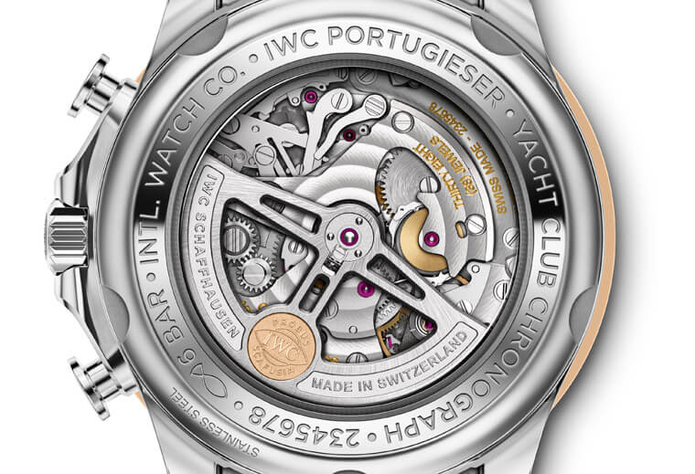 錶款這次搭載的還是與前作相同的89361機芯,機芯本身的規格如4Hz震頻、動力儲存68小時等都不變,翻到手錶背面也依舊是透明底蓋,但同時我們也發現了原本機芯自動盤下緣的品牌Logo和相關字樣都是類似鍍金的輪廓線,到了新款上頭,自動盤下緣中間的IWC Logo反而變成像是整塊K金材質鑲嵌,而左右兩側的字樣則不再鍍上金色,這算是新舊款之間微妙的變化細節。