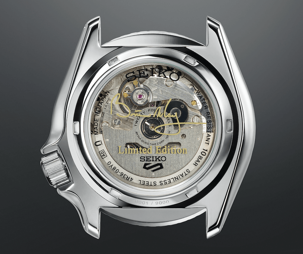 有感於Brian Harold May的傳奇搖滾魅力及理念影響著次世代,〈SEIKO 5 Sports〉特與其攜手合作推出聯名錶款。錶款面盤的意象主要源自Red Special的琴身設計,以壓鑄處理的手法展現出實木質感的紋路,並於鏡面進行研磨處理及加入漸層塗裝,重現了傳奇吉他所具備的各種精緻細節。作為聯名錶款的特殊樣式,底蓋上印有Brian May的專屬簽名以及0001/9000~9000/9000的限量編號。