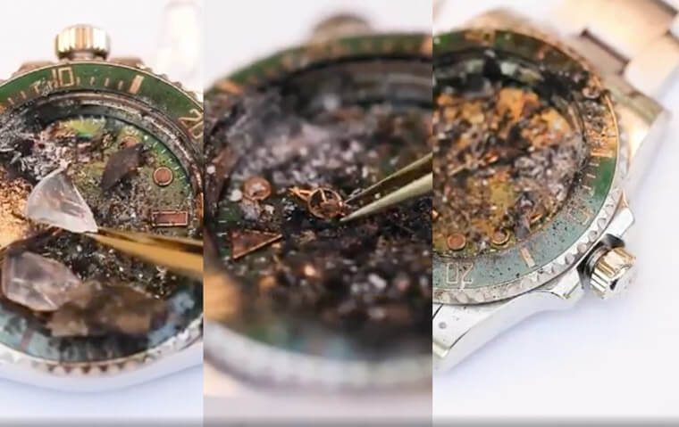 手錶損壞到什麼程度還有得救?其實只要內部不要壞得太嚴重,單純只是外部損傷的話,在有零件可以替換的情況下,手錶還是可以起死回生的。最近國外就有手錶修復師分享他經手的案例,如圖所見,這是一款被火燒到面目全非的勞力士綠水鬼116610LV,包括鏡面、陶瓷圈甚至是面盤和指針都被燒到破裂、焦黑、褪色和變形,不過不幸中的大幸是,這只綠水鬼的燒傷主要集中在手錶正面,其他部分如錶殼、底蓋等狀況都還可以,最幸運的就是手錶內部的機芯零件沒有被直接波及。
