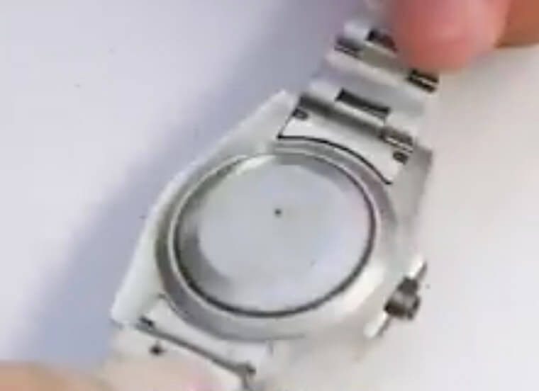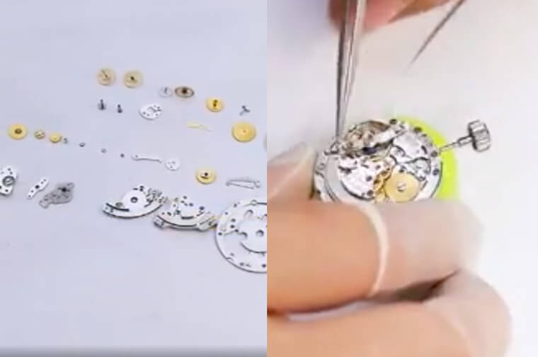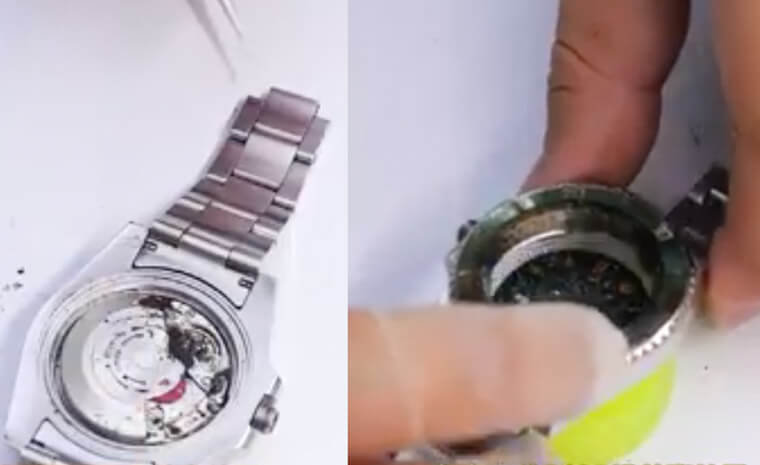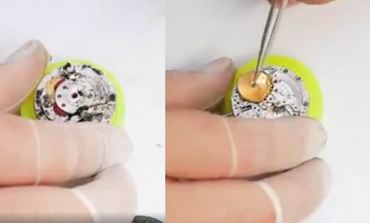 修復師首先就是先一一檢視手錶外觀的損壞程度,像是鏡面碎裂、指針彎曲,還有陶瓷圈焦黑等等,他先把正面燒毀的零件(主要是碎裂的藍寶石水晶)取下,接著再翻到錶背打開底蓋,然後依序把錶殼拆下、再把焦黑的綠色面盤拿掉,剩下的就是純粹的3135機芯,修復師看了看這枚機芯,發現大火並沒有對機芯造成太直接的影響,不過機芯內部還是產生了一些污垢需要處理,這時修復師開始一枚一枚卸下機芯零件,零件拆除後再把它們拿去清潔除鏽。
